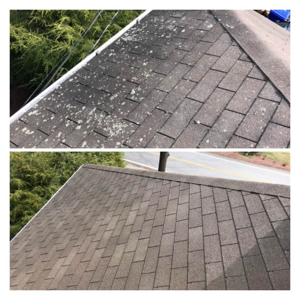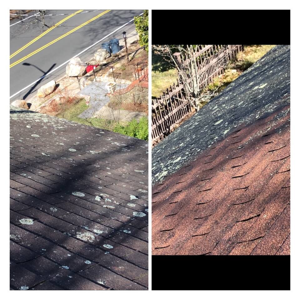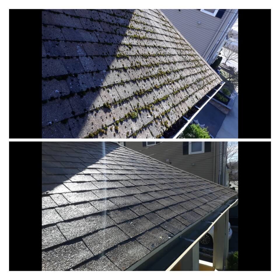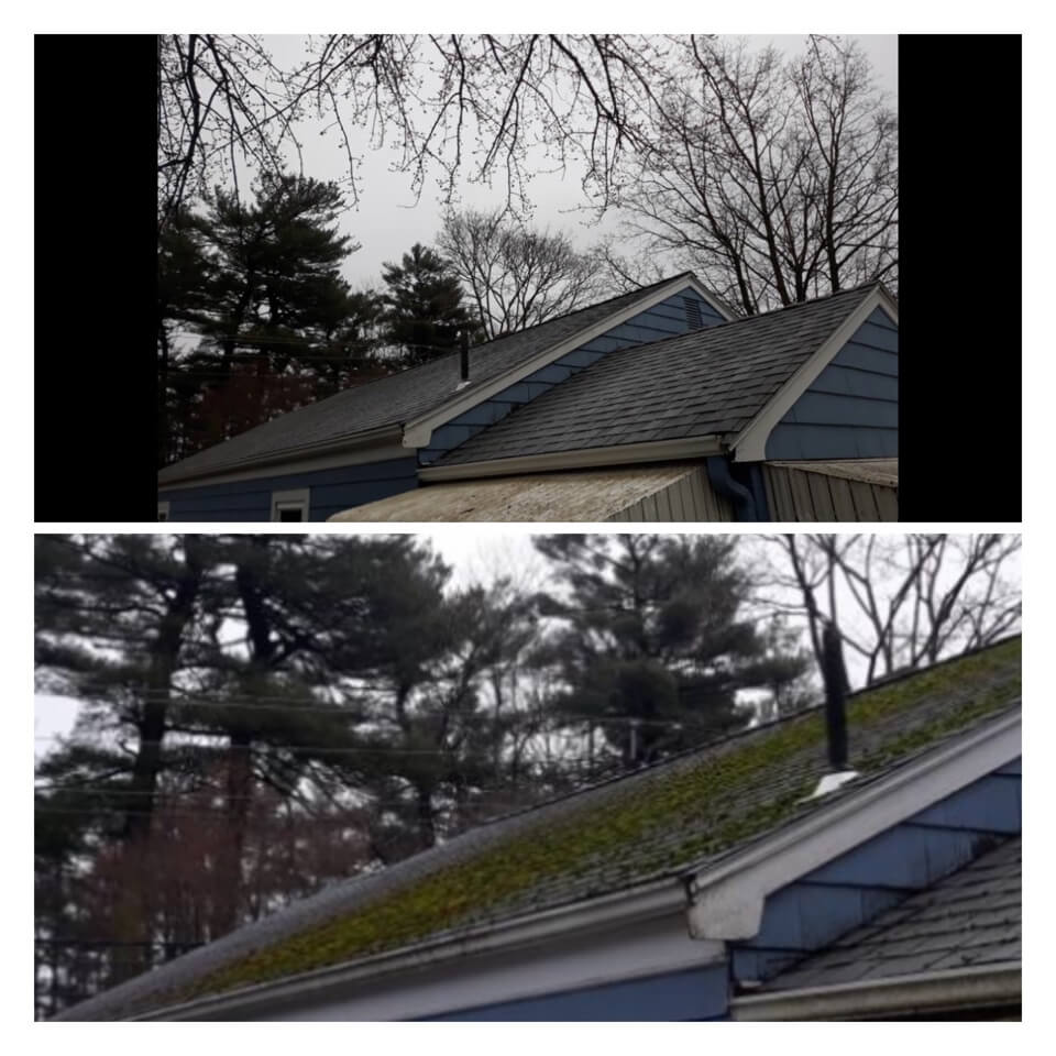 HiCleaners is the most experienced company in Cochituate, MA that deals with roof washing and roof soft washing. All of our employees are trained to recognize precise solution mixing ratios to provide you with the safest and most effective soft washing service. Roofs are a commonly neglected part of a house due to the fact that most people don’t have ladders to access it, so it is very easy to just leave it alone and forget about problems that may start to arise. Just like many home owners, discoloration and small bits of moss on a roof can be overlooked because of the misconception that it is just aesthetic. However, it isn’t just aesthetic, the moss slowly lifts the granules off the shingles which in turn shorten the life of the shingle. The moss also spreads, just like any bacteria if it is left alone for too long, it can quickly become a problem that spirals out of control. Call HiCleaners for a free quote, we only use the most advanced eco-friendly solutions and equipment to make sure the job is done right, for the safety of the employees, your plants, grass, pets, and children.